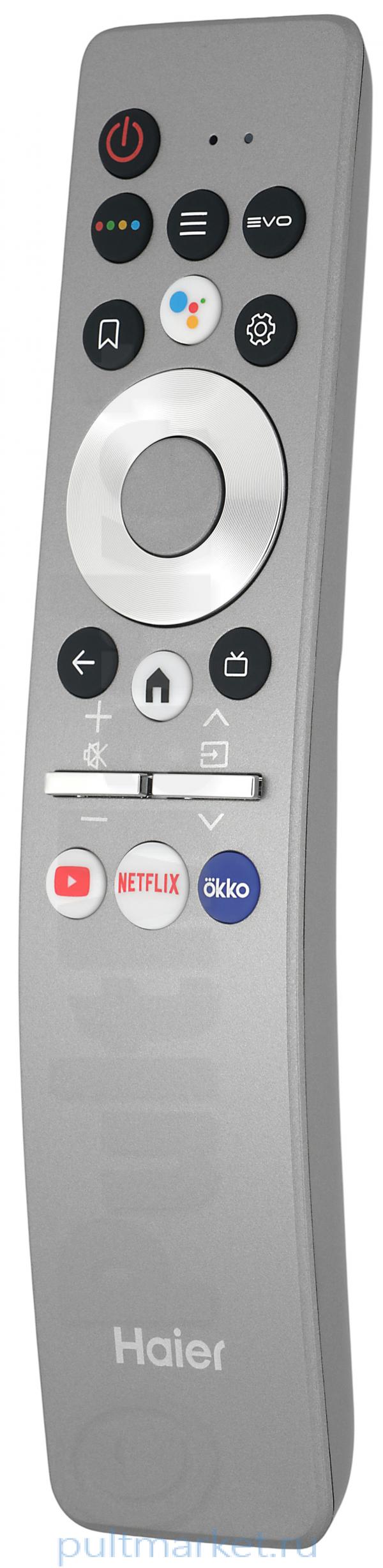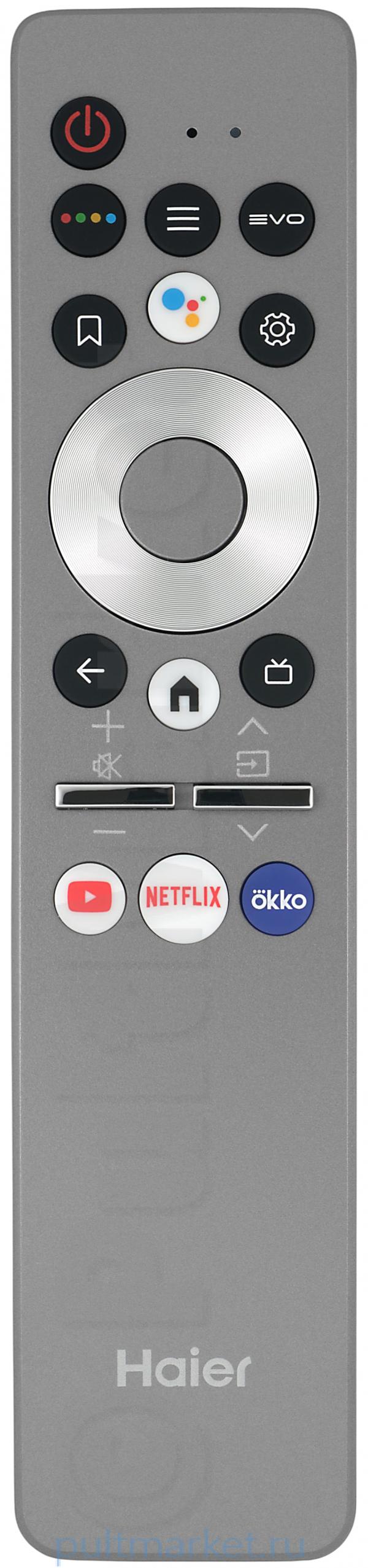 Пульт для телевизора Haier HTR-U29RG - оригинальное устройство с голосовым управлением, надёжным Гугл-Ассистентом. Для работы требуется купить к пульту Haier HTR-U29RG две мизинчиковые батарейки и произвести сопряжение с телевизором.
