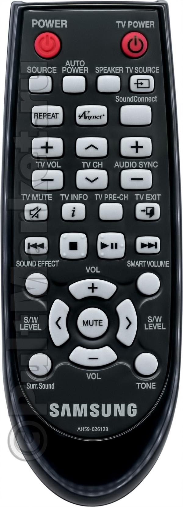 Пульт для саундбара Samsung AH59-02612B представлен на странице оригинальной версией, идеально заменяющей старое родное устройство. Изготовлен на заводе корпорации Samsung, поэтому качество гарантировано. Но чтобы уверенно купить пульт Samsung AH59-02612B, удостоверьтесь, что он идентичен девайсу, который комплектовался с вашим саундбаром. Можете поискать черно-белое изображение нужного пульта в инструкции от техники, если ваш потерялся. Также можно заглянуть в список совместимости, но он неполный.