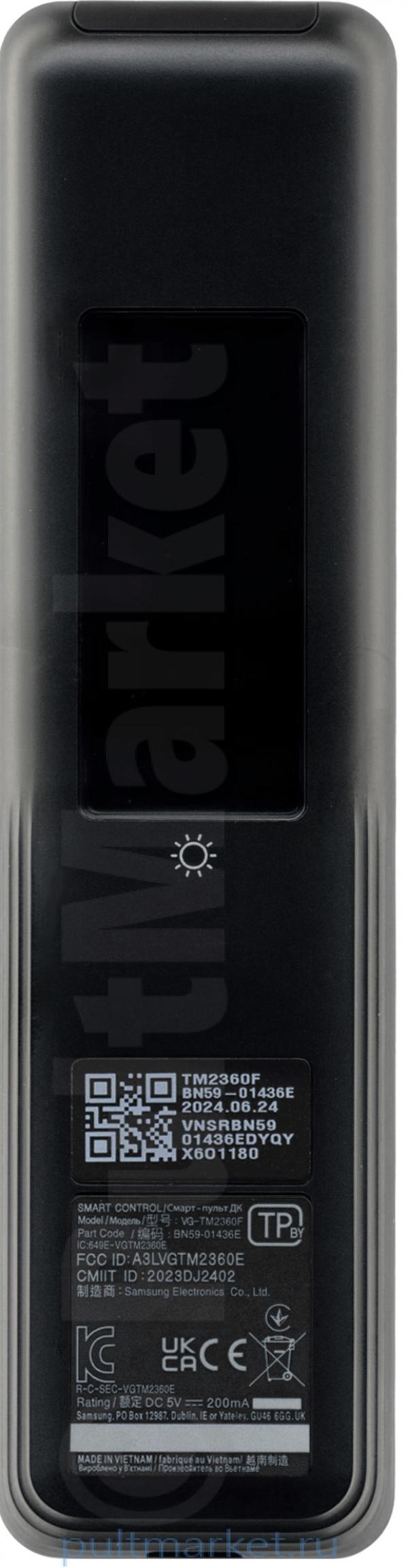 Samsung BN59-01436E (он же BN59-01436A в зависимости от партии) – интеллектуальный оригинальный Smart Control пульт для Smart TV с голосовым управлением и солнечной батареей (SolarCell Remote). Позволяет управлять Smart-телевизорами 2023-2024 годов выпуска, которые поставляются для российского рынка. Также заменяет модель BN59-01455Q и белую версию BN59-01456J.