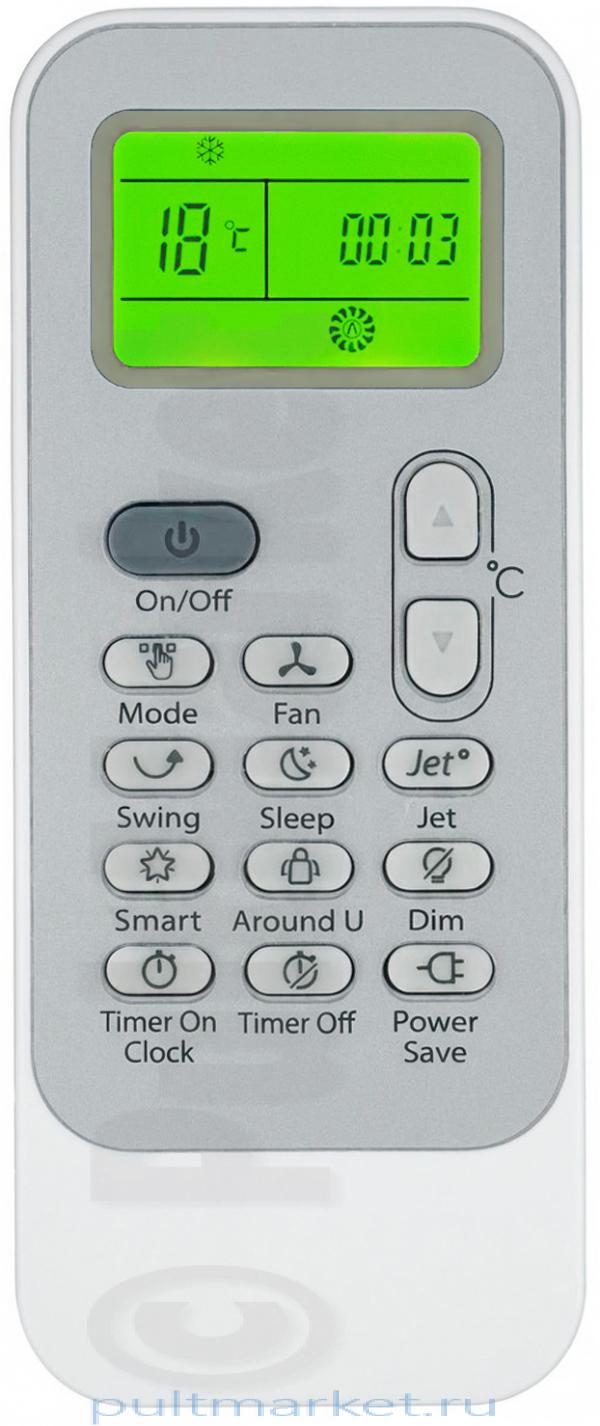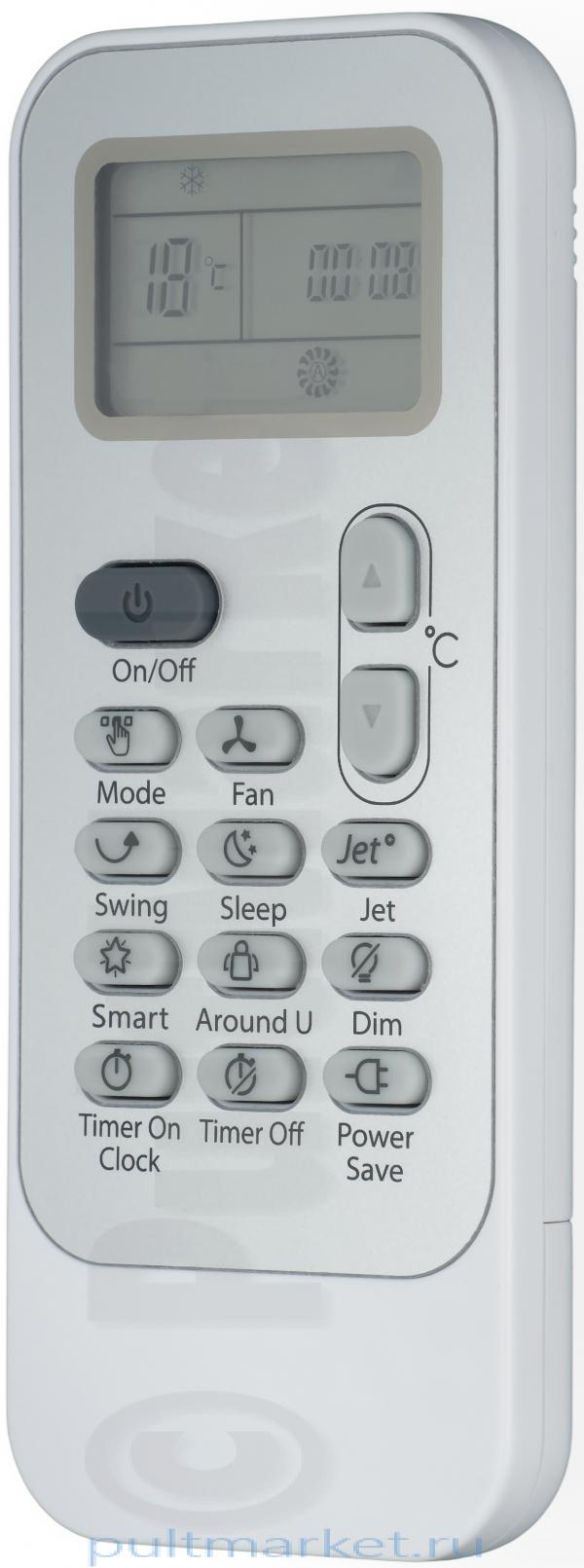 На корпусе для более комфортного управления установлен маленький черно-белый дисплей. На дисплее отображаются: температура, режим работы, скорость, время и прочие важные индикаторы. Сам пульт позволяет управлять полным функционалом кондиционера: включение системы, выбор режима работы, регулировка температуры и установка времени, активация экономного режима, выбор скорости вращения вентилятора и желаемого положения жалюзи, включение быстрого охлаждения или нагрева, активация таймера и другое.